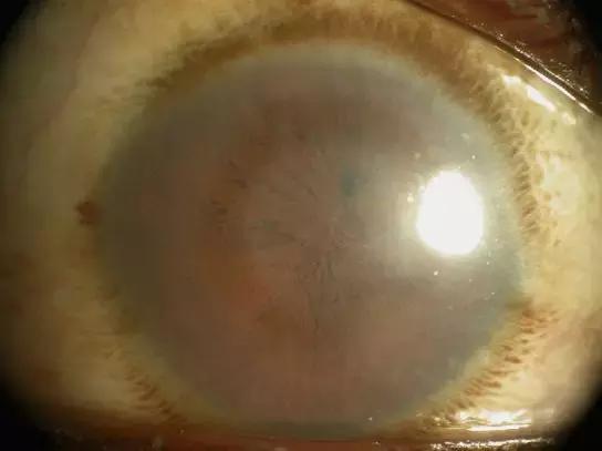 ?、笮停簹埬じ街诮悄ど?,殘膜自虹膜小環(huán)伸入角膜后表面,交匯處角膜呈現(xiàn)云翳狀混濁。