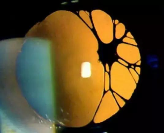 ?、裥停簹埬て鹩诤缒ば…h(huán),附著在虹膜上,呈線狀、網(wǎng)狀、膜片狀,臨床最為常見(jiàn)。