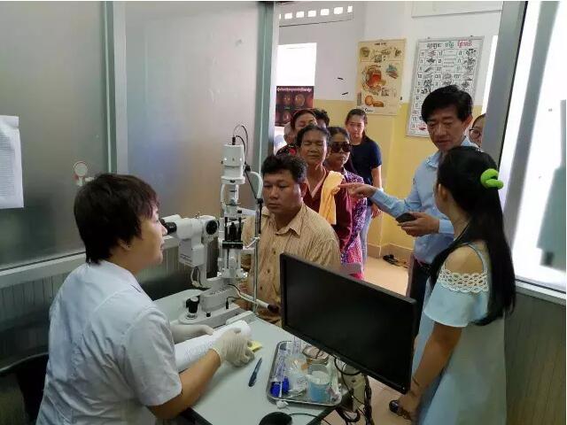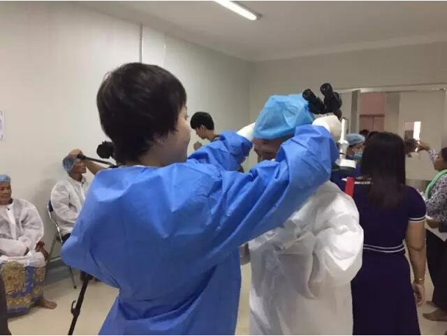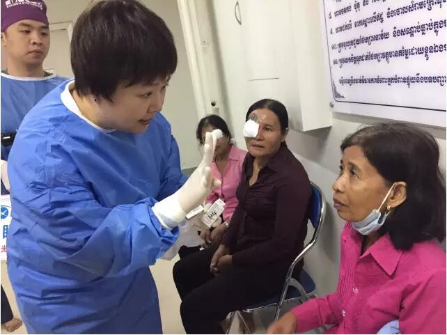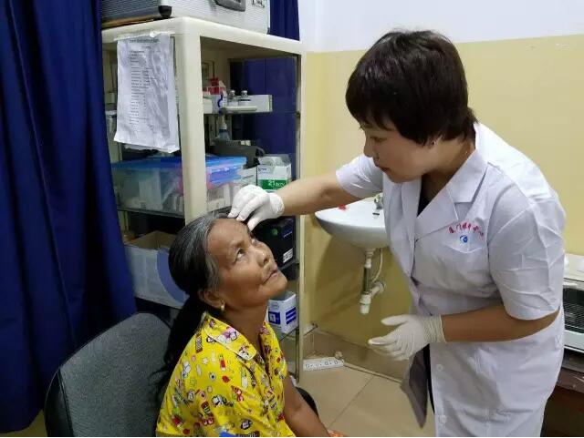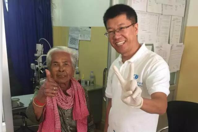 這個(gè)情況被手術(shù)結(jié)束出來取晶體的護(hù)士看到了,她報(bào)告給了醫(yī)療隊(duì)隊(duì)長(zhǎng)李立梅博士,李博士聽到后立刻走出手術(shù)室來到老人身旁,握起老人的手親切問到:“奶奶,你怎么了?是哪里不舒服嗎?”老人用弱小地聲音結(jié)結(jié)巴巴地回答了一堆柬語,經(jīng)過翻譯翻譯后才知道,老人是因?yàn)楹ε率中g(shù)心里緊張,再加上手術(shù)室的冷氣才發(fā)抖的。