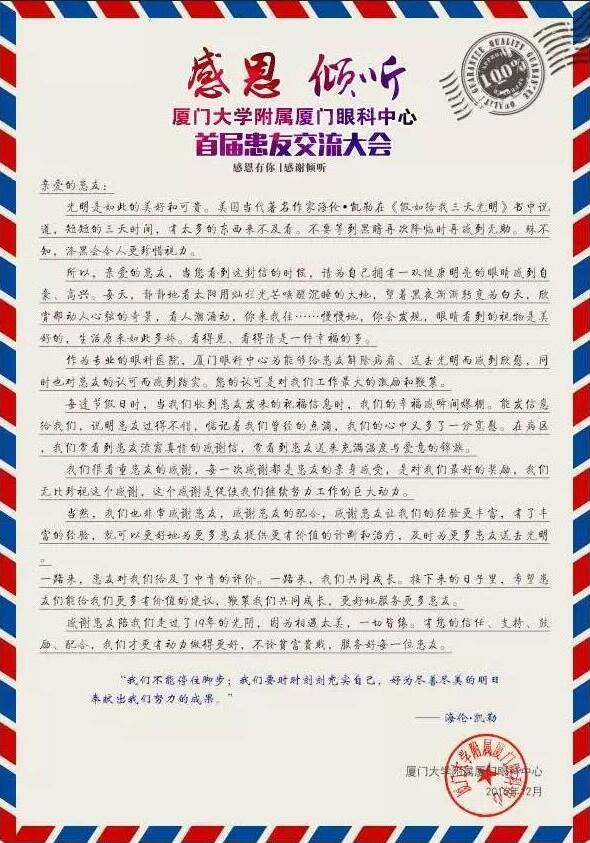 廖大姐是一名高度近視患者,2014年在廈門眼科中心做了雙眼白內(nèi)障手術,回想起之前的就診經(jīng)歷,大姐還歷歷在目。當天更是揚揚灑灑寫了三頁的感謝信在交流會上宣讀。