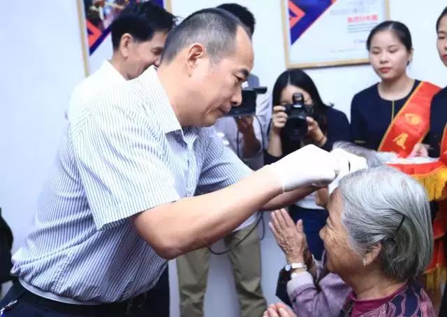 當(dāng)嘉賓們?yōu)楠{子會(huì)各服務(wù)隊(duì)贈(zèng)予獎(jiǎng)牌并頒發(fā)感謝狀之后,揭紗儀式正式開啟,大家期待已久的關(guān)鍵時(shí)刻終于到來。在醫(yī)護(hù)人員的指導(dǎo)下,與會(huì)嘉賓們分別帶上白色手套,一一為現(xiàn)場(chǎng)的已接受白內(nèi)障治療的患者代表揭開蒙在眼睛上的紗布。當(dāng)光明重新進(jìn)入患者的眼中,諸位患者眼里留下了激動(dòng)的淚水。霎時(shí)間,歡呼聲、談笑聲交織在一起,無論是重獲光明的白內(nèi)障患者,還是有幸親手為他們揭開紗布的人們,臉上都洋溢著幸??鞓返墓獠?,現(xiàn)場(chǎng)變成一片愛的海洋!