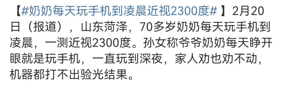 2月20日,山東菏澤發(fā)生了一起引人關(guān)注的健康事件:一位70多歲的老奶奶因長時間沉迷手機,導(dǎo)致近視度數(shù)竟高達2300度。
