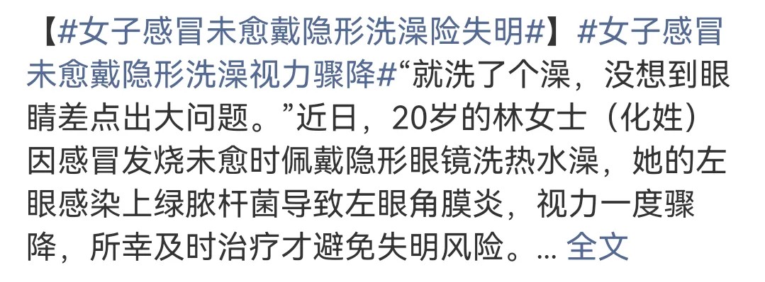 日前,一則#女子感冒未愈戴隱形洗澡險失明#的新聞沖上熱搜: